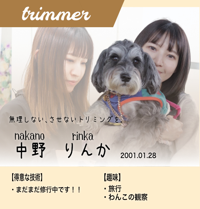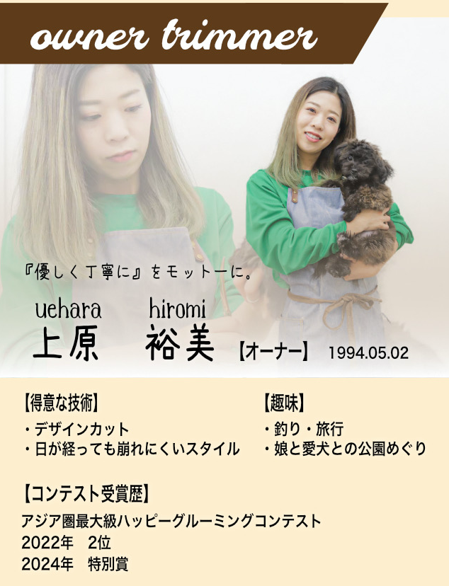 専門学校を卒業後、トリミングをメインに個人サロン、大手ショップ、生体販売ブリーダーの元でアルバイトなど様々な経験を積んできました。